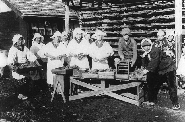 こうして、干し芋生産は前渡村を中心に周辺の町村に広がっていき、1933年に県内の干し芋製造戸数は2,350戸、生産数量は3,260トンにまでなりました。しかし、戦争が激しくなるにつれ、サツマイモは主食に回され、戦争末期には干し芋製造は事実上禁止されてしまいました。