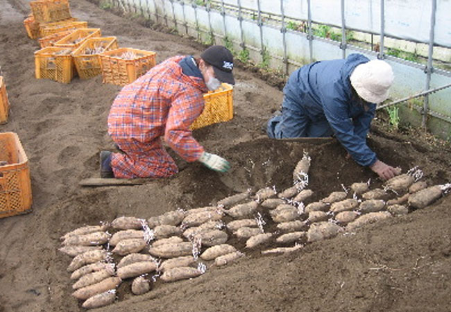 苗をつくるため、さつまいもを苗床(なえどこ)に伏せていきます。芋を、芽が出やすい状態に並べて土をかけ温かくしてあげることにより芋自身に、春だときづかせることにより芽が出る。