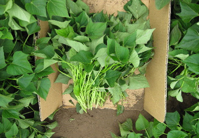 苗は、信じられないかもしれませんが、切ったまま土に植えます。節のひとつひとつから根が生えて芋が育つのです。